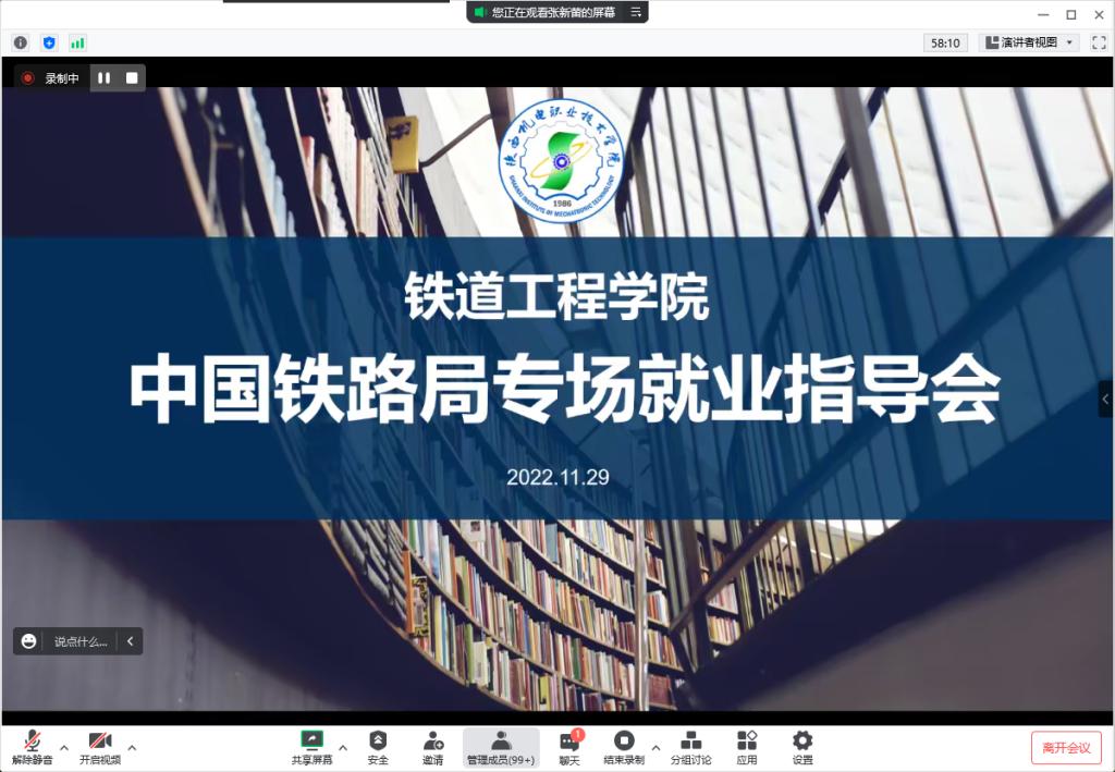 公司于11月29日晚,针对2022年秋季中国铁路局社招要求,举行了中国铁路局专场就业指导会。公司党支部书记、经理贾九荣、副经理卢彦峰全程参加了本次会议,公司600多名师生参加了就业指导会。会议由教学与管理办公室主任张新蕾主持。会议通过腾讯会议方式举行。