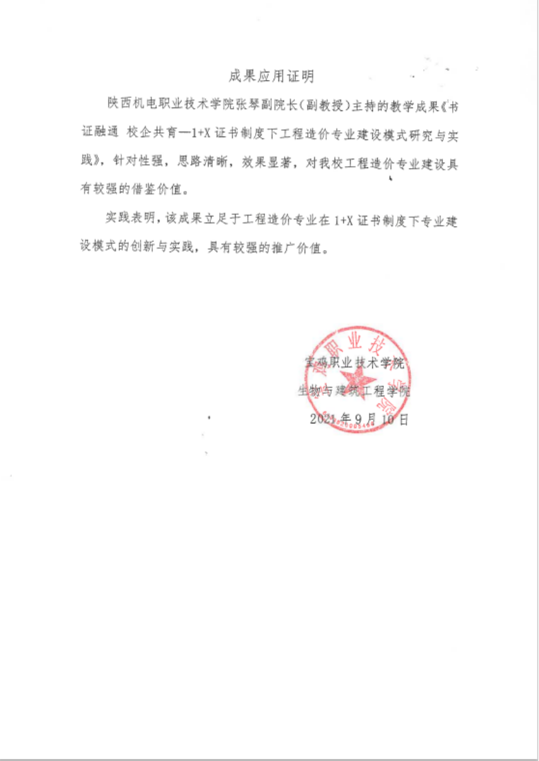成果名称:书证融通校企共育—1+X证书制度下工程造价专业建设模式研究与实践