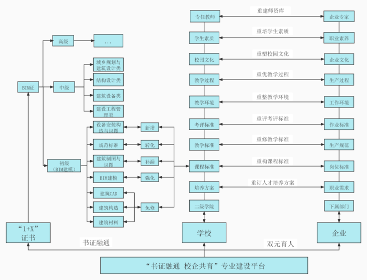 建筑信息化的发展理念已成为建筑行业转型升级的新目标和新任务,而BIM技术是推动建筑业数字化发展的重要技术。为紧跟产业升级,满足转型升级对BIM人才的需求,落实校企深度融合任务。按照学历证书和职业等级证书两种证书相互衔接和相互融通的建设思路,形成了独具特色的1+X(BIM)证书制度下的“书证融通、校企共育”工程造价专业建设模式,可以紧跟产业升级需要,使人才培养与企业需求无缝对接。解决了专业人才培养滞后于产业升级需要,缺乏行之有效的专业建设模式问题。