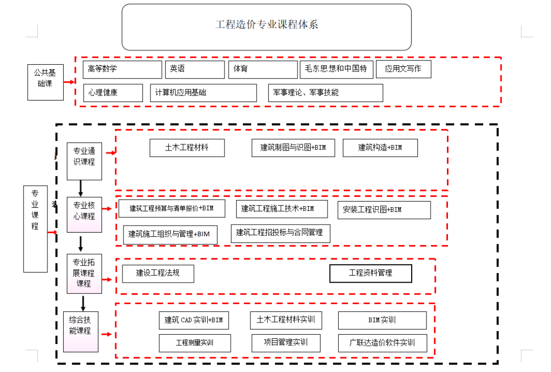 为落实1+X证书制度,增强工程造价专业服务经济和社会发展的能力,调动社会力量参与人才培养,科学构建工程造价课程体系。在分析工程造价专业职业岗位能力、职业等级证书考试大纲的基础上,利用BCG矩阵理论,按照工程造价专业就业岗位占比和1+X(BIM)职业技能等级证书相关度两个维度重构专业课程。通过职业技能等级标准与专业教学标准对接,“X”证书培训内容与专业课程教学内容融通,“X”证书培训过程与专业教学过程一体化设计,“X”职业技能考核与专业课程考试同步化进行,“1”与“X”相互转换。构建了以“九维育人”为核心的同心多元化专业课程体系,细化岗位职业素养和能力要求,深入研究1+X职业技能等级标准,按照“核心-基础-专项-拓展”的思路,解决了将1+X(BIM)证书职业技能等级要求、岗位能力要求和专业课程体系的有效融合问题。