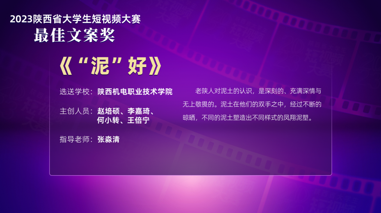 近日,由陕西省委网信办指导,西安市委网信办、当代融媒体研究院主办,陕西网承办的2023陕西省老员工短视频大赛颁奖典礼在西安交通大学兴庆校区举行。西安市委网信办副主任袁永君,当代陕西杂志社、陕西省广播电视局、西安交通大学等相关单位负责人、支持单位负责人、评委代表、参赛团队共120余人出席颁奖仪式。公司由伟德victor1946张淼清老师指导,赵培硕、李嘉琦、何小转、王倍宁四位同学主创作品《“泥”好》荣获最佳文案奖。
