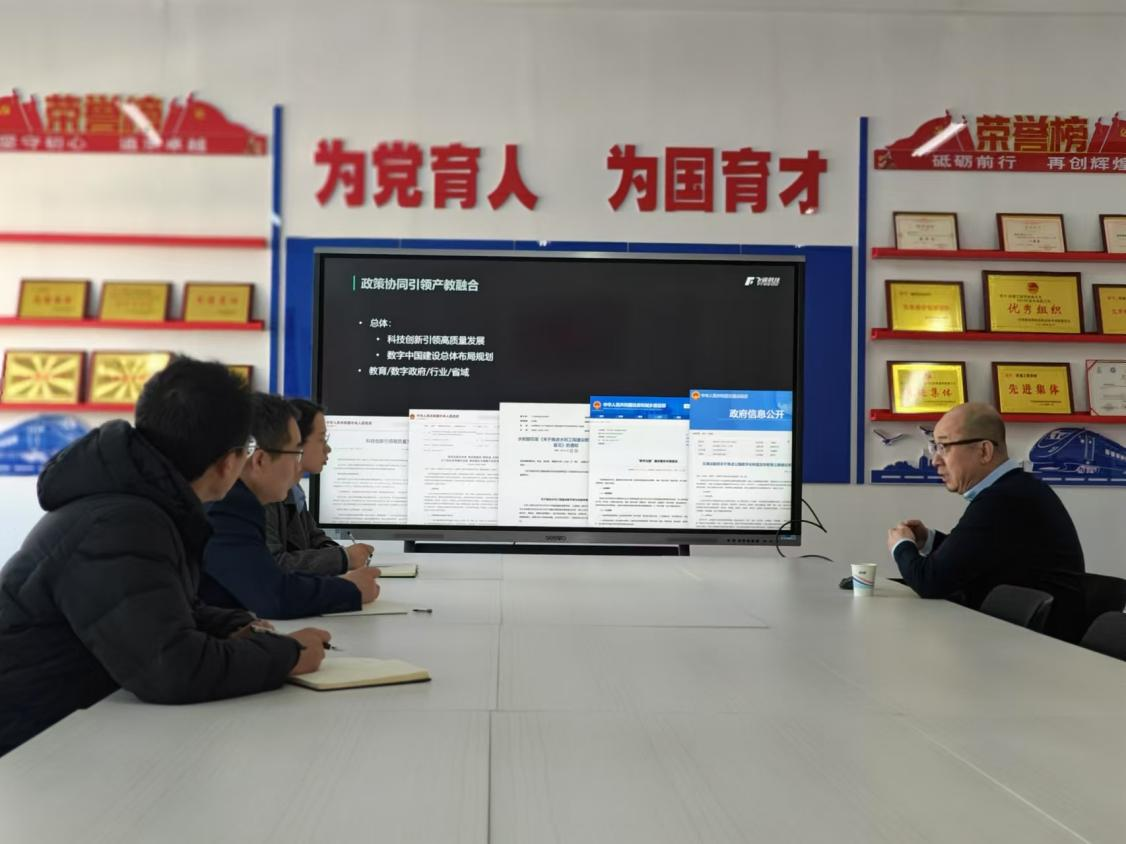 卢彦峰经理首先对企业代表的到来表示热烈欢迎,并介绍了公司的基本情况。徐玉明经理介绍了北京飞渡科技股份有限公司的业务范围、合作院校以及全国数字孪生与城市信息行业产教融合共同体工作规划。在交流中,徐玉明经理从国家政策、行业需求、人才培养、课程开发、技能大赛等多个维度介绍了数字经济育人领域的发展远景。