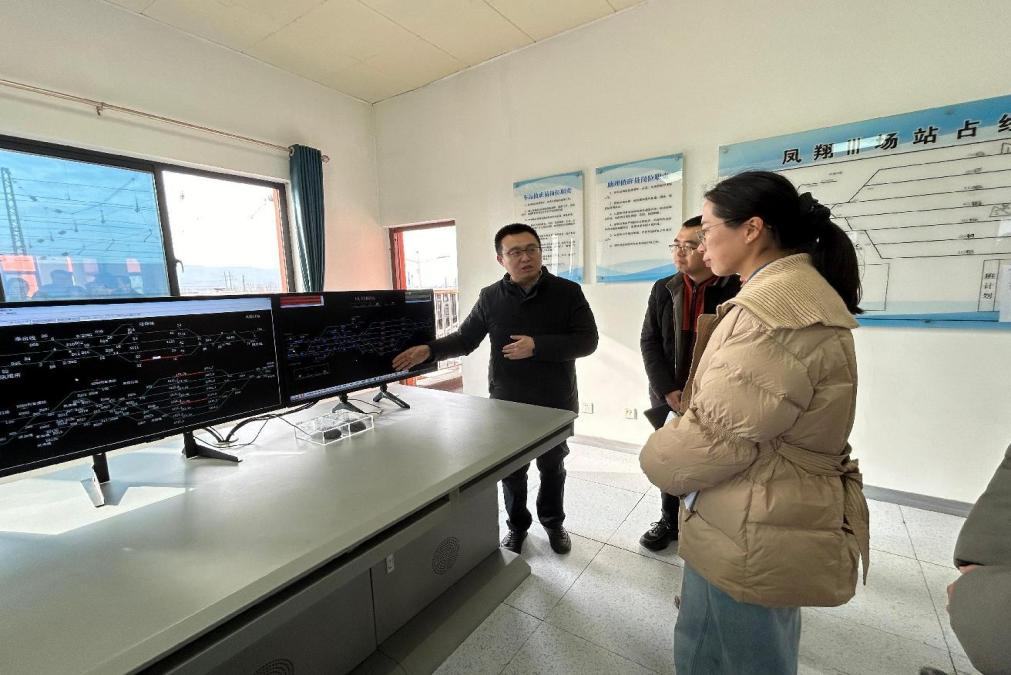 在长青铁路公司凤翔三场信号楼,公司教师们参观了凤翔三场行车室,通过联锁显示屏实地观测到列车运行图、线路占用情况、车辆位置等信息以及调度员们有条不紊地发出各项指令的全过程。