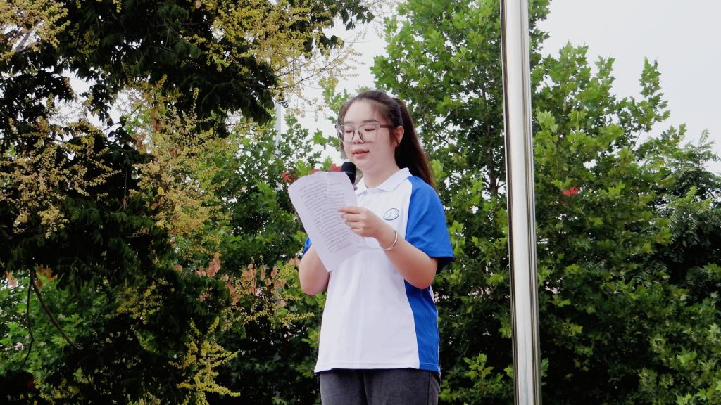 一抹华夏红,万千爱国情。伴随嘹亮的口号声,仪仗队迈着整齐划一的步伐,护送国旗走向国旗台。随着激昂的《义勇军进行曲》响起,全体师生行注目礼,鲜艳的五星红旗冉冉升起,迎风飘扬。