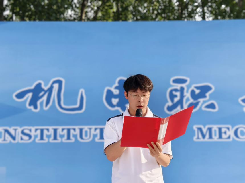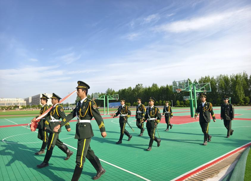 上午7时50分,升国旗仪式正式开始。第一项为出旗环节,擎旗手为24建工管理班王荣同学,护旗手为24机电技术9班史正栋、张宇超同学,指挥手为24机电技术9班杨立和24机电技术1班高霄博同学。伴随着铿锵有力的步伐,国旗护卫队护送鲜艳的五星红旗入场。
