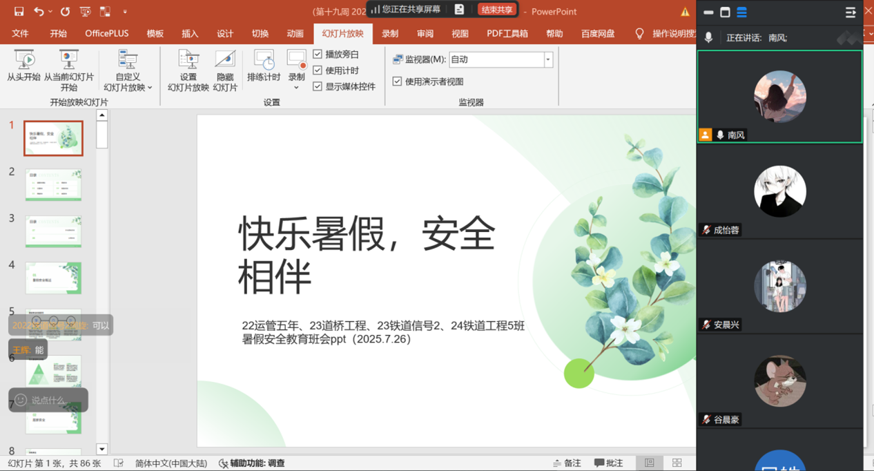 接着,班会针对防溺水、防电诈、防火防盗、防自然灾害、食品安全、消防安全、网络安全、交通安全、高温天气防中暑、心理安全等方面进行了深入讲解,使同学们熟悉常见的安全知识,并能做好有效防范。
