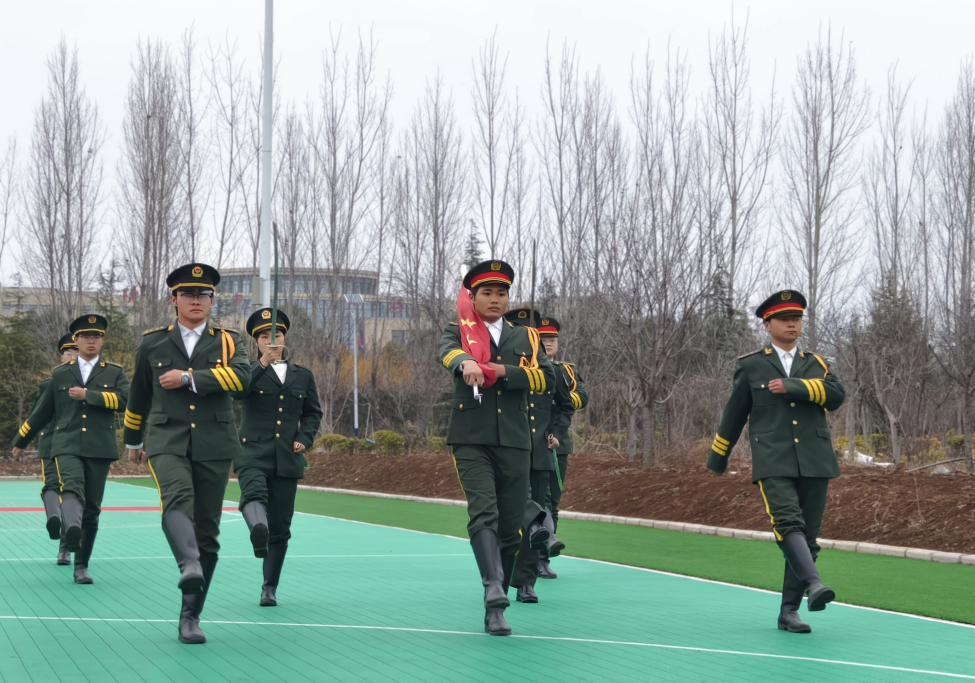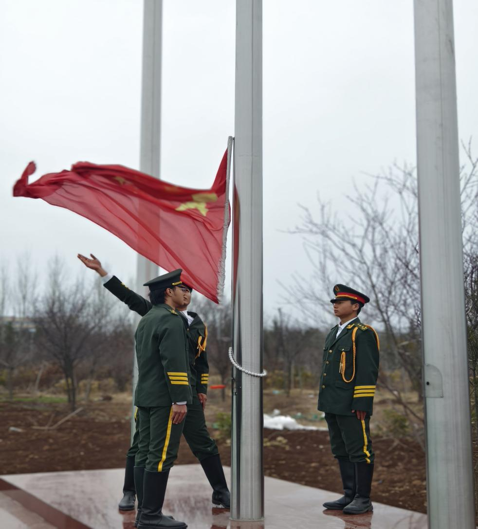 伴随着激昂的音乐,升国旗仪式正式拉开帷幕。第一项议程是出旗仪式。本次升国旗的擎旗手由24铁道工程管理专业的王荣同学担任,他步伐矫健有力,护送鲜艳的五星红旗迈向旗杆,尽显新时代青年的飒爽英姿与坚定信念。护旗手24机电技术1班的高宵博和24机电技术9班的杨立紧跟其后,身姿挺拔、神情肃穆,为升旗仪式增添了庄重神圣之感。指挥手由24铁道工程4班的赵鹏和24建筑消防2班的赵甜甜共同担任,他们手势精准、指挥有力,引领全场师生齐声高唱国歌,激昂的旋律在校园上空久久回荡,点燃了每个人心中的爱国热情与民族自豪感 。