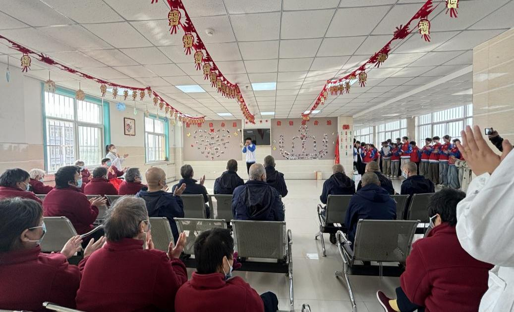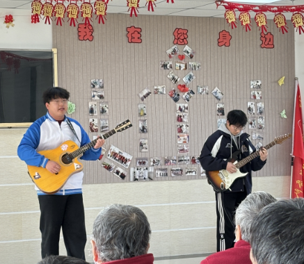 志愿者们为老人们准备了精彩的文艺节目。活动在24建筑工程2班陈鸿斐同学一曲深情的《望乡》中正式开始,悠扬的歌声瞬间拉近了彼此的距离。随后,24道桥班张铭桢同学带来的秦腔折子戏《二堂舍子》字正腔圆、韵味十足,赢得了满堂喝彩。25铁道工程1班马永燕等同学表演的藏舞,节奏欢快、舞姿优美,为现场带来了别样的民族风情。最后,在辅导员与志愿者们合作的吉他弹唱中,第一环节在轻松愉快的氛围中落下帷幕。