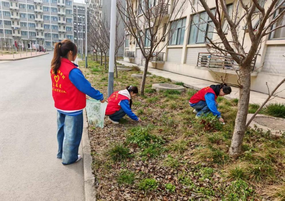 最后,志愿者们走进员工公寓区域,聚焦宿舍周边花坛、绿植区域及楼道公共空间,开展环境整顿工作。他们仔细清理花坛内的杂草、纸屑和废弃杂物,清理公共区域垃圾,用双手为同学们打造了干净、舒适的居住环境。