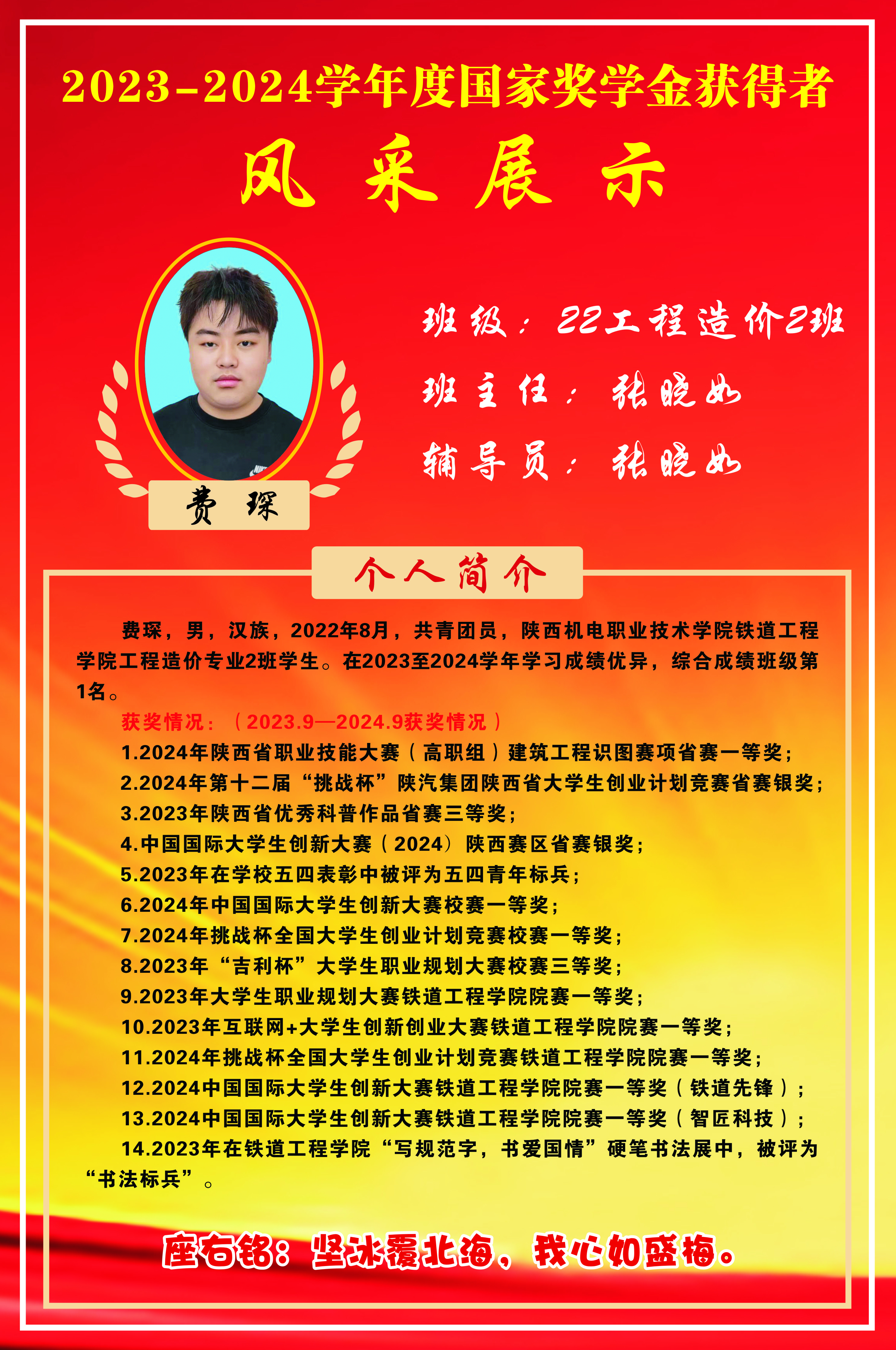 2023-2024国家奖学金获得者风采展示-22工程造价2班费琛