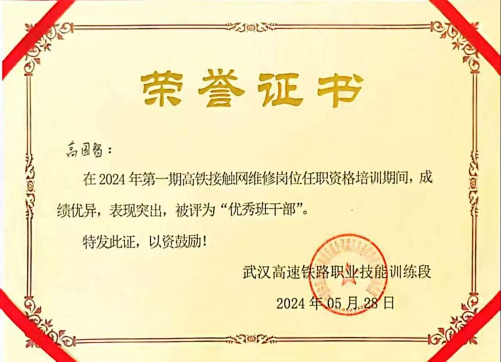 高国智深知职场蜕变的基石是母校的培育!严格的“严管厚爱”和“勇往直前,敢为人先”的火车头精神,早已将铁的意志铸入血脉。老师们常说,铁路人要永葆铁道学子本色——不惧苦累、精研业务、勇立潮头。这份教诲成为他职业生涯的精神灯塔。面对工作中的技术硬骨头和高强度挑战,他凭母校锻造的“铁韧劲”,潜心钻研资料、虚心拜师求教,直至难题变通途——这便是新时代铁路青年攻坚克难的风采!正是母校赋予的精神力量,支撑他在高铁接触网维护岗位上稳步前行,将青春热血化作守护铁路安全的坚实力量。