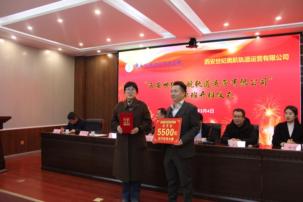 为激励订单班员工努力学习,西安世纪奥航轨道运营有限公司向公司捐赠奖学金,满春燕代表公司向公司授予了捐赠证书。订单班的员工代表侯显瑞进行了表态发言,他号召同学们立志要成为具有社会责任感、创新精神和实践能力的高素质技术技能型人才。